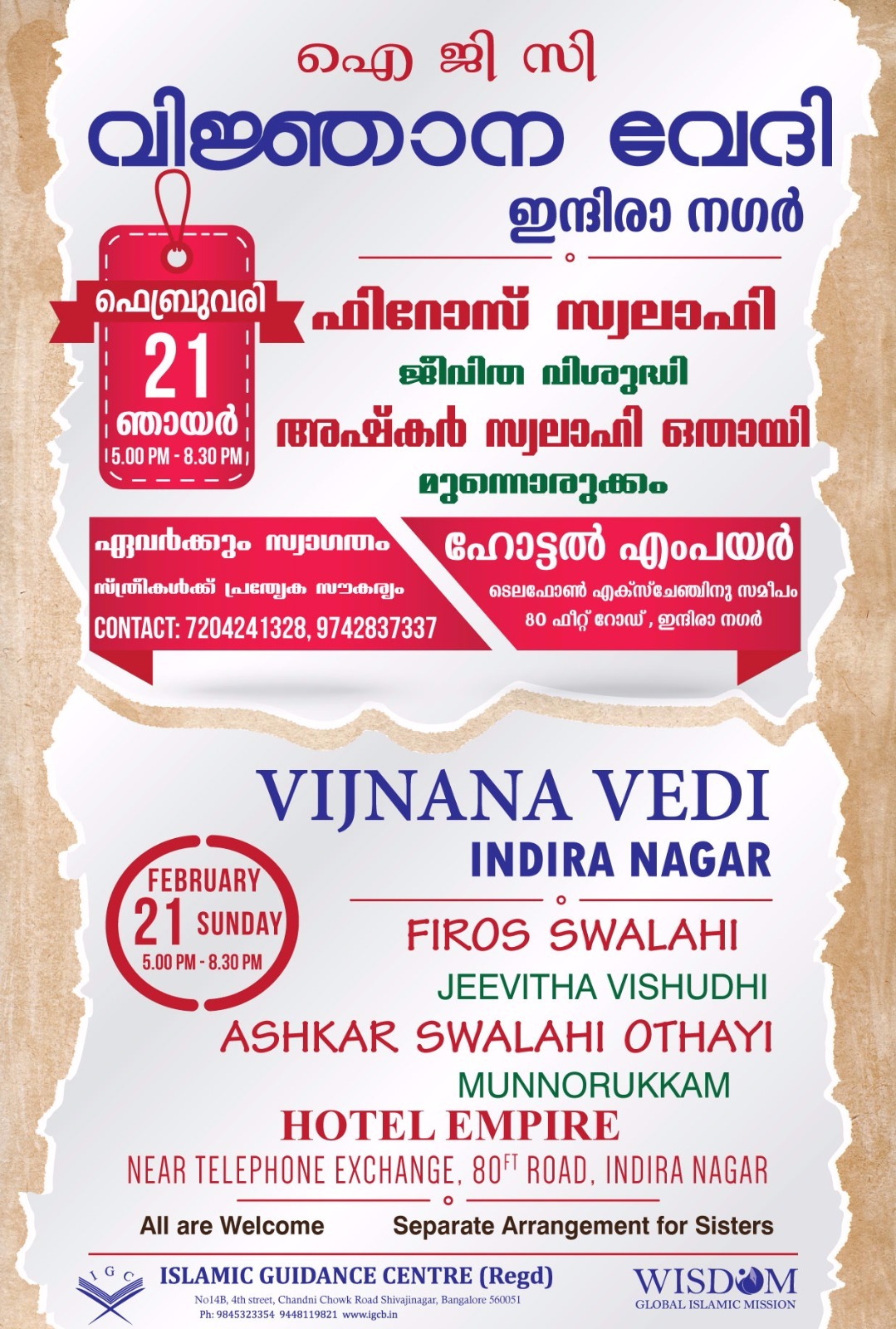 IGC ഇന്ദിരാനഗർ വിജ്ഞാനവേദി Posted on February 20, 2016August 20, 2016 by Fasalu ഇസ്ലാമിക് ഗൈഡൻസ് സെൻറെർ ഇന്ദിരാനഗർ ഏരിയ കമ്മറ്റി സംഘടിപ്പിക്കുന്ന വിജ്ഞാനവേദി ഫെബ്രുവരി 21 ഞായർ 5 pm മുതൽ 8:30 pm വരെ ഇന്ദിരാനഗർലെ ഹോട്ടെൽ എംമ്പയറിൽ വെച്ച് നടക്കും. ഏവര്ക്കും സ്വാഗതം!